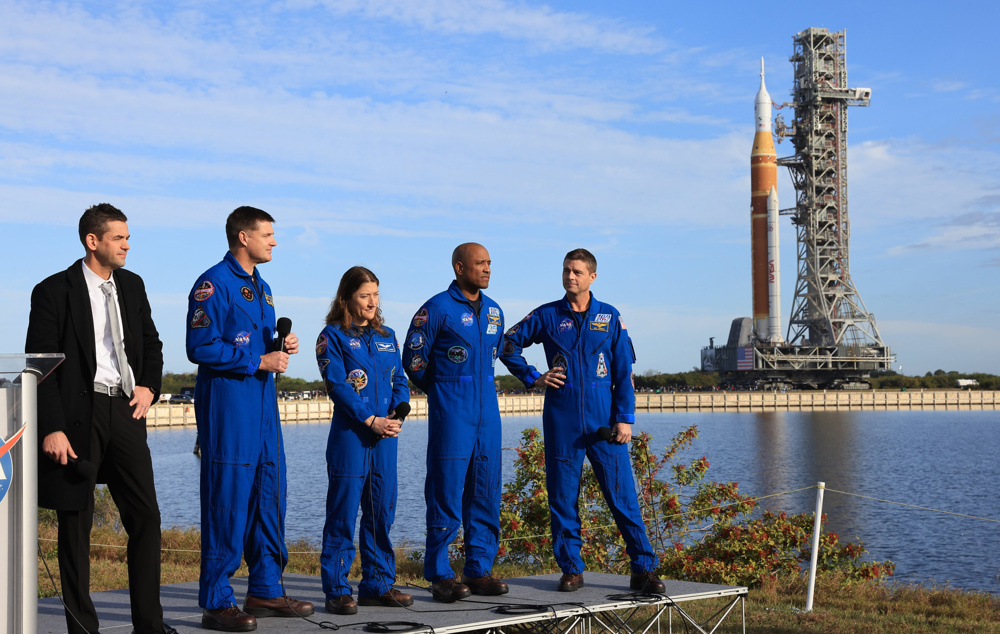 Astronautene og NASA-sjefen ved Kennedy Space Center etter at Artemis 2 var blitt rullet ut til oppskytingsplattformen.