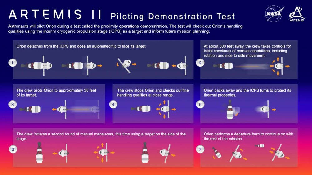 En viktig test gjelder manøvrering av romskipet med tanke på at det på senere ferder skal gjennomføres møte med en månelander (Artemis 3) og romstasjonen Gateway (fra og med Artemis 4). Under Artemis 2 skal denne testen utføres mens romskipet fremdeles befinner seg i jordbane - like etter at det er koblet fra bærerakettens andre trinn (ICPS - Interim Cryogenic Propulsion Stage). ICPS skal da brukes som mål, men det er naturligvis ikke snakk om nærkontakt, i og med at det ikke er noe å koble seg til på ICPS.