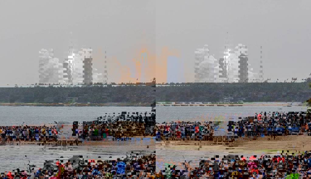 Tittelbildet: Folkefest under CZ-5B-oppskytingen av Tianhe 29. april. Hvorvidt sangkoret til høyre klarte å overdøve raketten er det ikke sagt noe om. (AFP - STR)