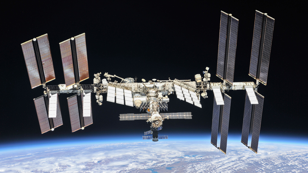 Bildet over viser Den internasjonale romstasjonen ISS i bane rundt Jorden, ett av ytterst få romfartsprosjekter hvor Vesten vil fortsette å samarbeide med Russland tross sistnevntes invasjon av Ukraina den 24. februar 2022.