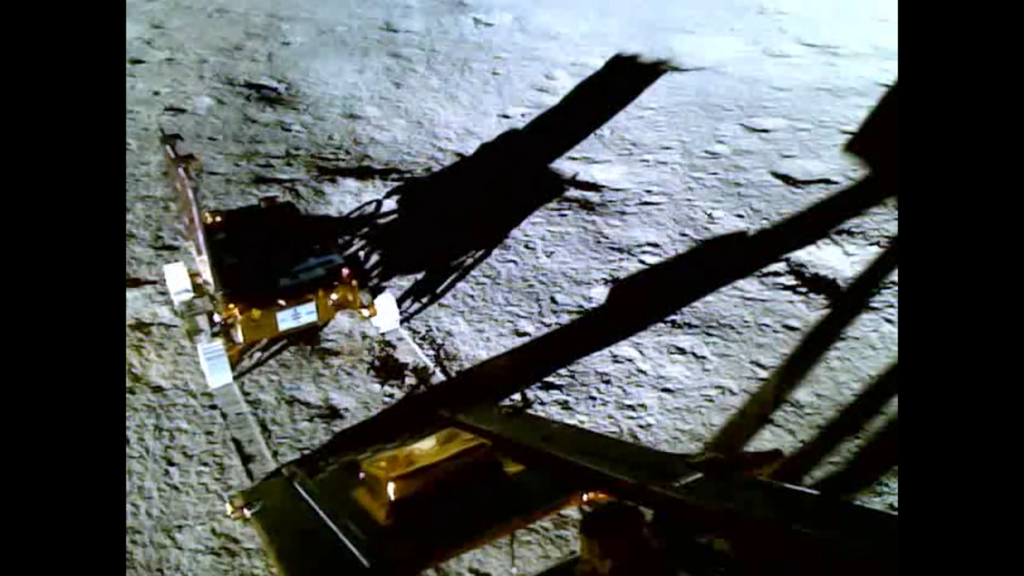 Bildet over viser månebilen Pragyan rett etter at den hadde kjørt ned på Månens overflate fra Chandrayaan-3s landingsfartøy Vikram.