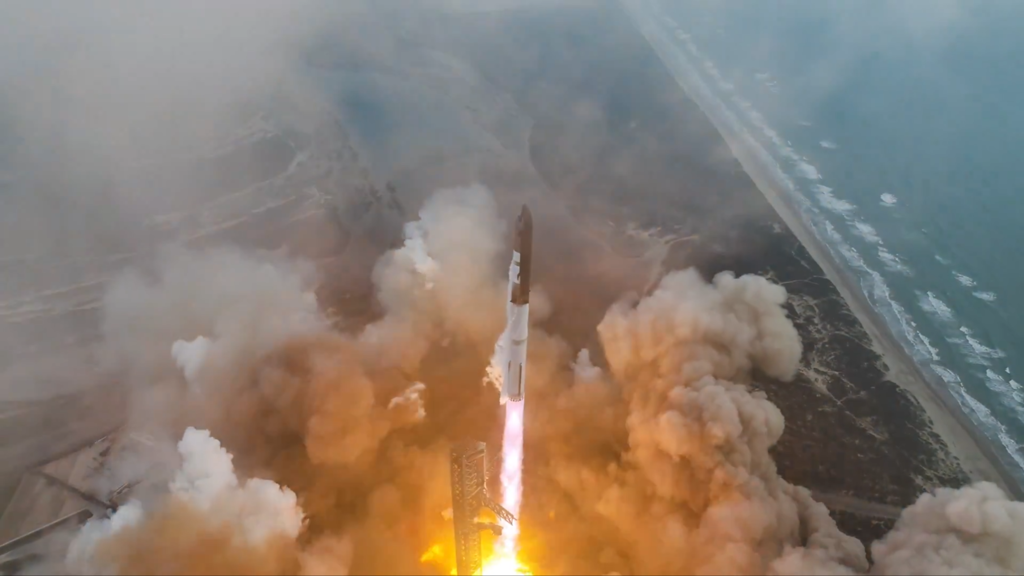 Over: Starship 28/Booster 10 forlater oppskytingsrampen ved Starbase i Boca Chica, Texas på IFT-3-ferden den 14. mars 2024. Som under IFT-2 den 18. november 2023 så det ut til at systemet hvor kolossale mengder vann fosser opp under oppskytingsrampen også denne gang fungerte tilfredsstillende og dermed hindret like store ødeleggelser av rampen som under IFT-1 i april 2023.