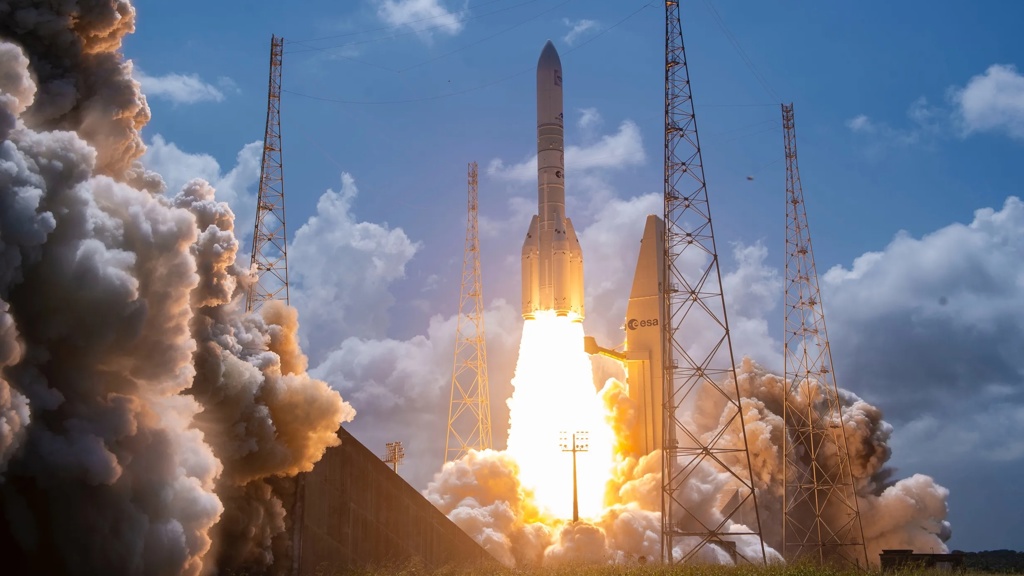 Over: Første oppskyting av en Ariane 6-rakett med fire faststoffmotorer, og den første med et langt nyttelastdeksel.