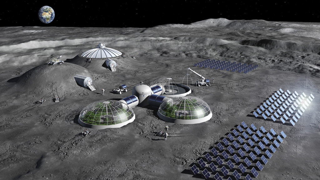 OVER: Illustrasjon av en tenkt, bemannet base på Månen, publisert av ESA i 2019.